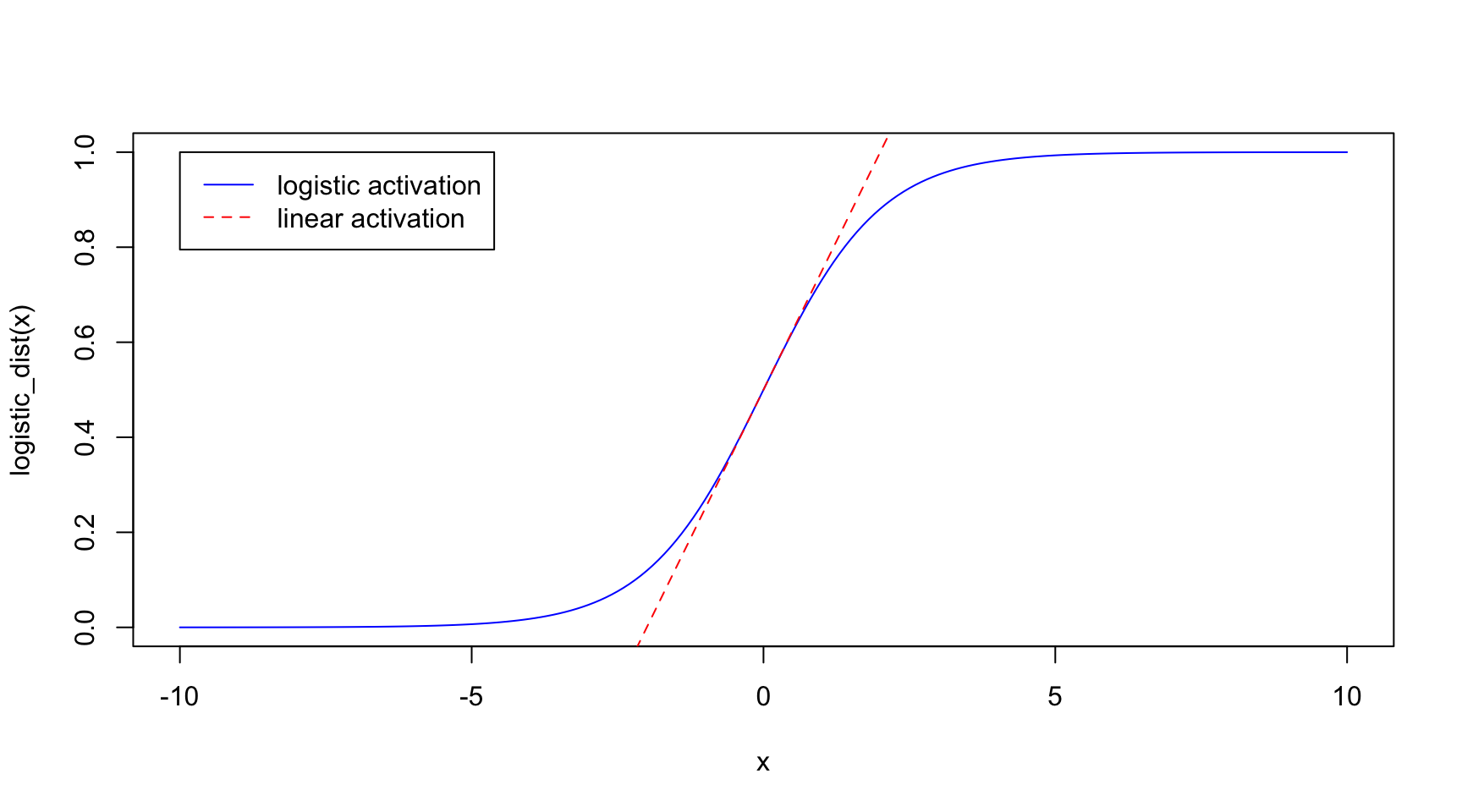 For probabilities of between 0.3 to 0.7, we see that the logistic activation function maps very closely to that of a simply linear one. It is only at the more extreme probabilities that they diverge.